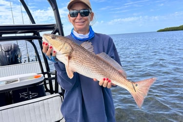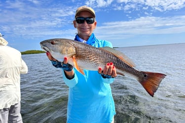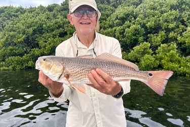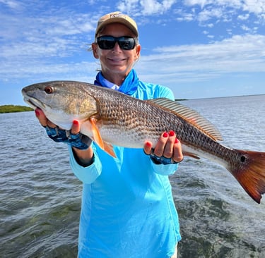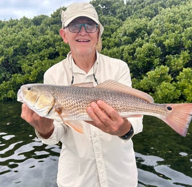 The fishing picked up as the tide reached the islands and the Reds retreated into the overhanging branches on the gulf islands. Captain Meyer expertly cast underneath the branches where the bugger Reds were hiding. They readily took shrimp and cut Lady fish. They limited out multiple times.